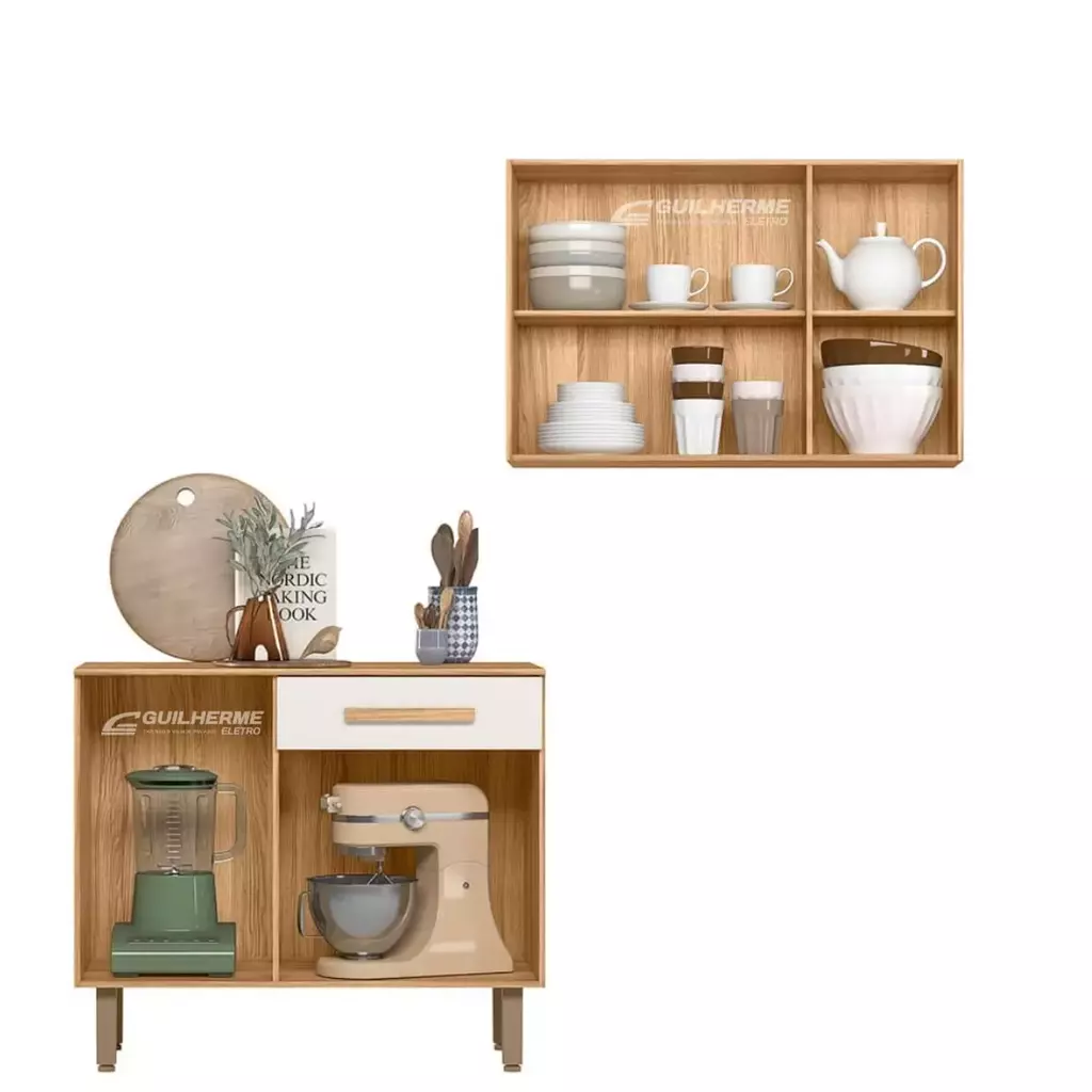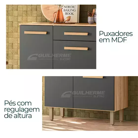 Os puxadores de madeira 100% MDF proporcionam um toque sofisticado, enquanto a estrutura robusta assegura durabilidade ao longo dos anos. Cada detalhe foi pensado para oferecer não só beleza, mas também funcionalidade à sua cozinha.